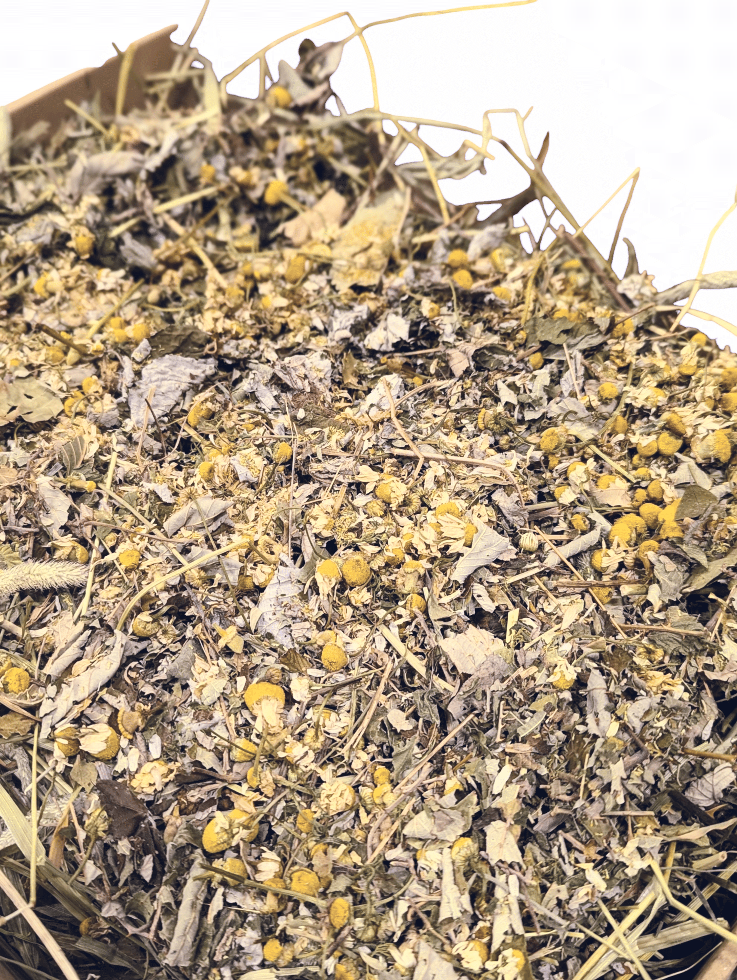 Sekoituksen (400 g) Heinäkaupan kuivaheinää, kuivattuja karhunvatukan lehtiä, kuivattuja vadelman lehtiä ja kuivattuja kamomillan kukkia. Ihanan tuoksuinen terveyspommi! Heinän alkuperä on isokyröläisellä pellolla ja kuivatut yrtit ovat kasvaneet Saksassa.
