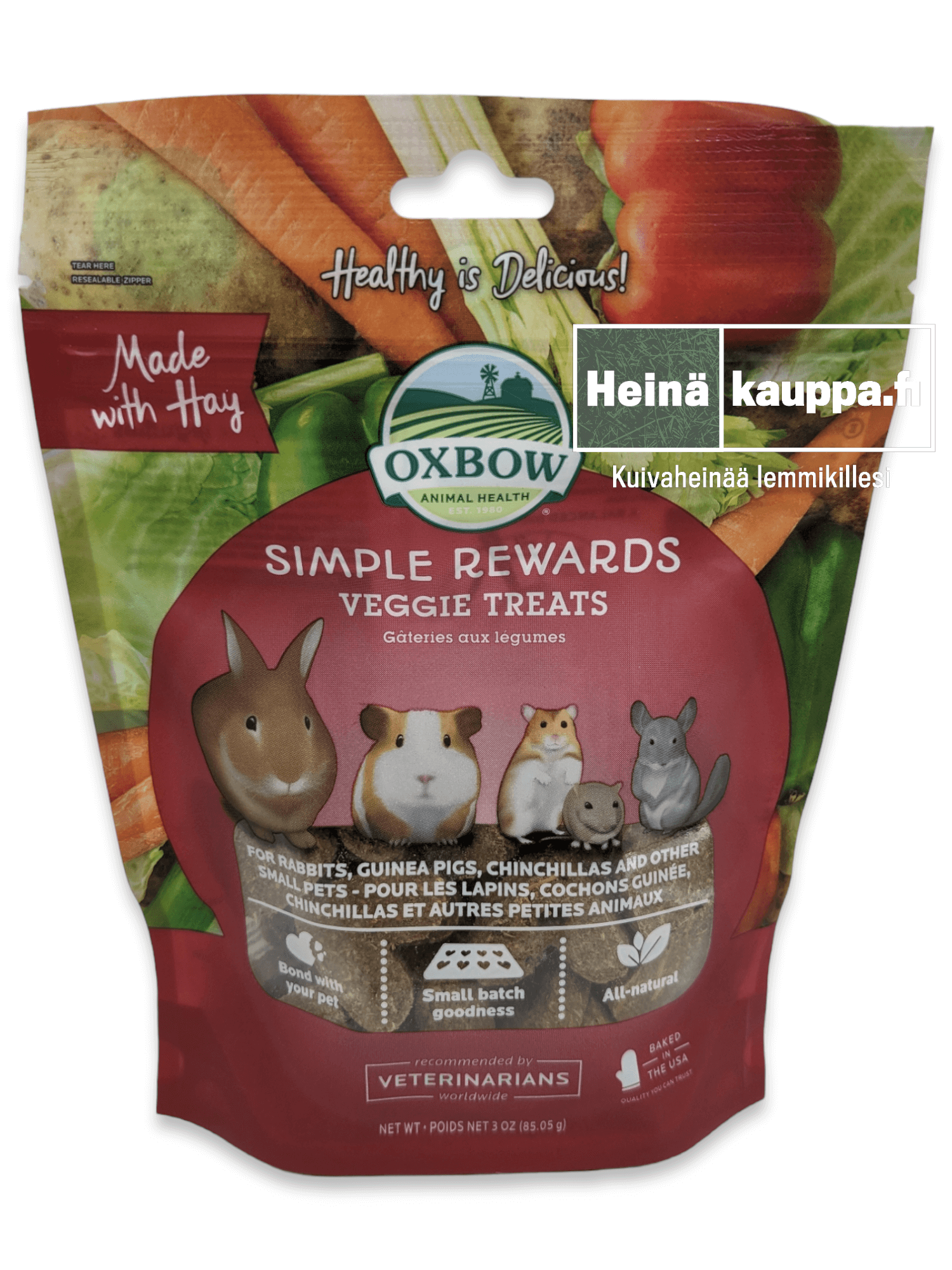 Suoraan puutarhasta lemmikkillesi – kasvishyvää Oxbow Animal Healthilta! Oxbow Veggie Treatsin terveellinen, uunissa paistettu keksi on sekoitus vihanneksia ja on maukas ja ravinteikas makupala lemmikkillesi. Herkkumme tarjoavat ravitsemustasapainon, jonka eläimet löytävät luonnollisista elinympäristöistään, ja auttaa lisäämään terveellistä vaihtelua lemmikkisi ruokavalioon. Simple Rewardsin avulla voit tarjota lemmikillesi terveellisen ja herkkupalan.